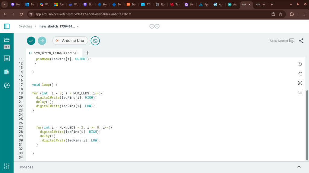 wij hebben laatst een opdracht gekregen. Wij moesten een rijtje van lichtjes heen en weer om de beurt aan laten gaan. wij konden zelf kiezen hoe hard de lampjes gingen want je kon zelf instellen hoelang je de delay wou hebben.